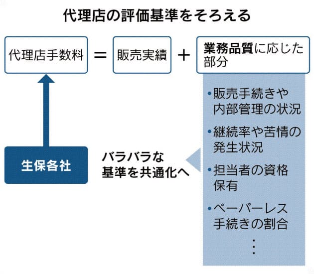 生命保険各社は乗り合い代理店に支払う販売手数料に関する業界共通の基準を取り入れる。医療保険など複数の保険会社の商品を扱う代理店では、保険会社から支払われる販売手数料の多寡によって販売する商品が左右されるとの懸念がある。各社が加盟する生命保険協会で代理店の評価を統一し、過度な販売促進を是正する。代理店経由の保険契約が増えるなか、顧客の意向に沿った販売を徹底する。