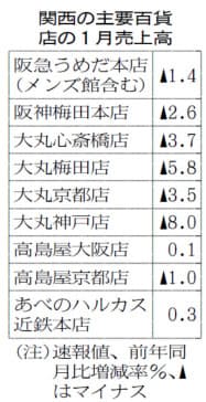 関西の主要百貨店4社が3日に発表した1月の売上高(速報値)は、9店中7店で前年実績を下回った。消費増税前の駆け込み需要の反動減が続くほか、暖冬の影響も響いた。1月末に新型肺炎の感染拡大に伴う渡航制限が実施されたものの、1月の免税売上高は9店全店で前年実績を超えた。