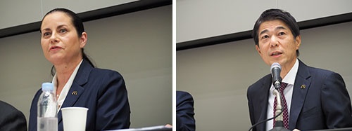 日本マクドナルドホールディングスのサラ・カサノバ社長兼CEO(左)と日本マクドナルドの日色保社長兼CEO