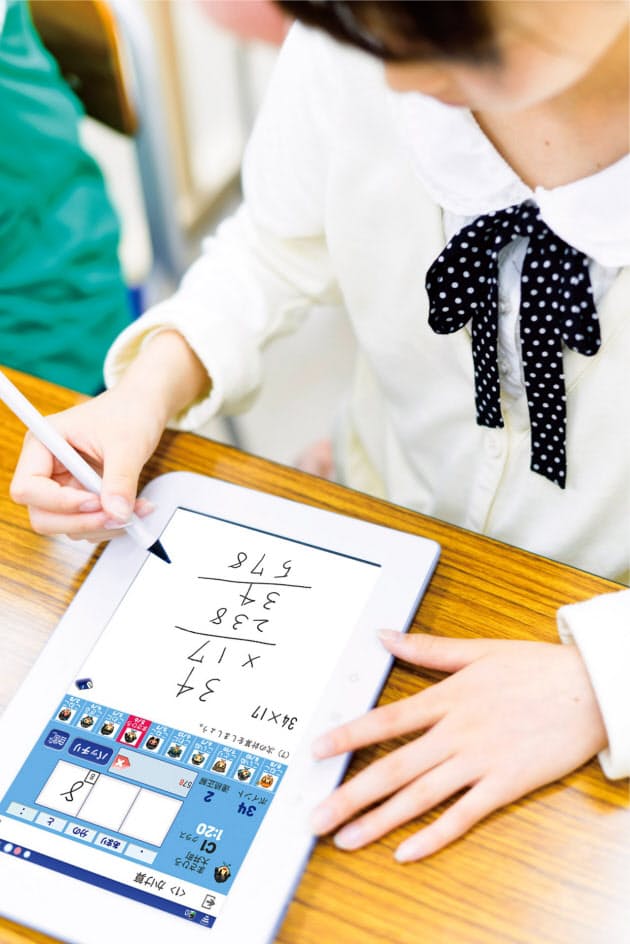 画面上にタッチペンで書き込みができるタブレットにフレンズの専用アプリを入れて使う。生徒が解答を書くと、一問ずつ即時に採点。正答率や解答までの時間をポイントに…