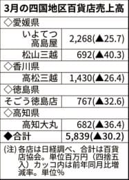 日本百貨店協会が公表した四国地区にある百貨店の3月売上高合計は、前年同月比30.2%減の58億3900万円だった。マイナスは6カ月連続。新型コロナウイルスの感染拡大に伴う外出自粛要請や、営業時間の短縮などで来店客数が伸び悩んだ。