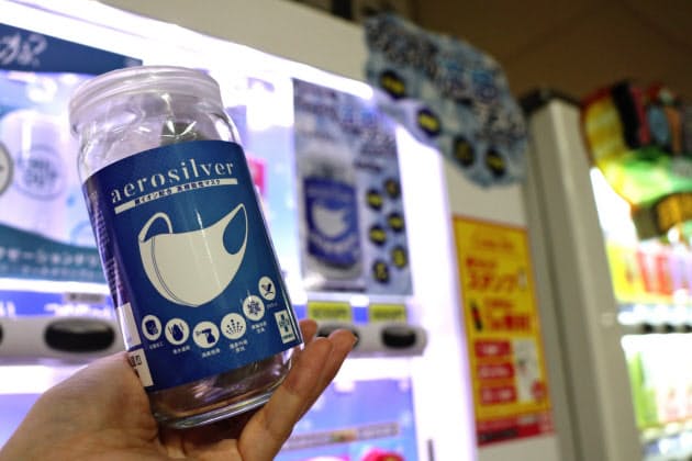 買い物客が集まる東京・池袋のサンシャインシティ(東京・豊島)の西側の入り口に自販機がある。見た目は冷たいお茶やジュースが並ぶ普通の自販機だが、商品列の一角にガラス瓶に入ったマスクが並んでいる。