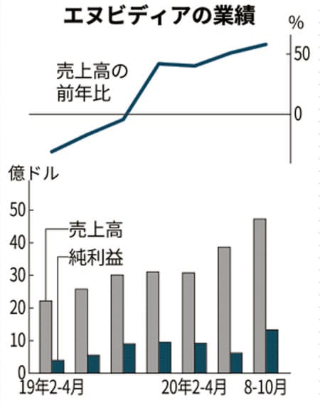 【シリコンバレー=佐藤浩実】米エヌビディアが18日発表した2020年8~10月期決算は、売上高が前年同期比57%増の47億2600万ドル(約4900億円)だった。二本柱であるゲームとデータセンター向けの半導体をともに伸ばし、2四半期連続で過去最高となった。純利益は49%増の13億3600万ドルで、10四半期ぶりに過去最高を更新した。